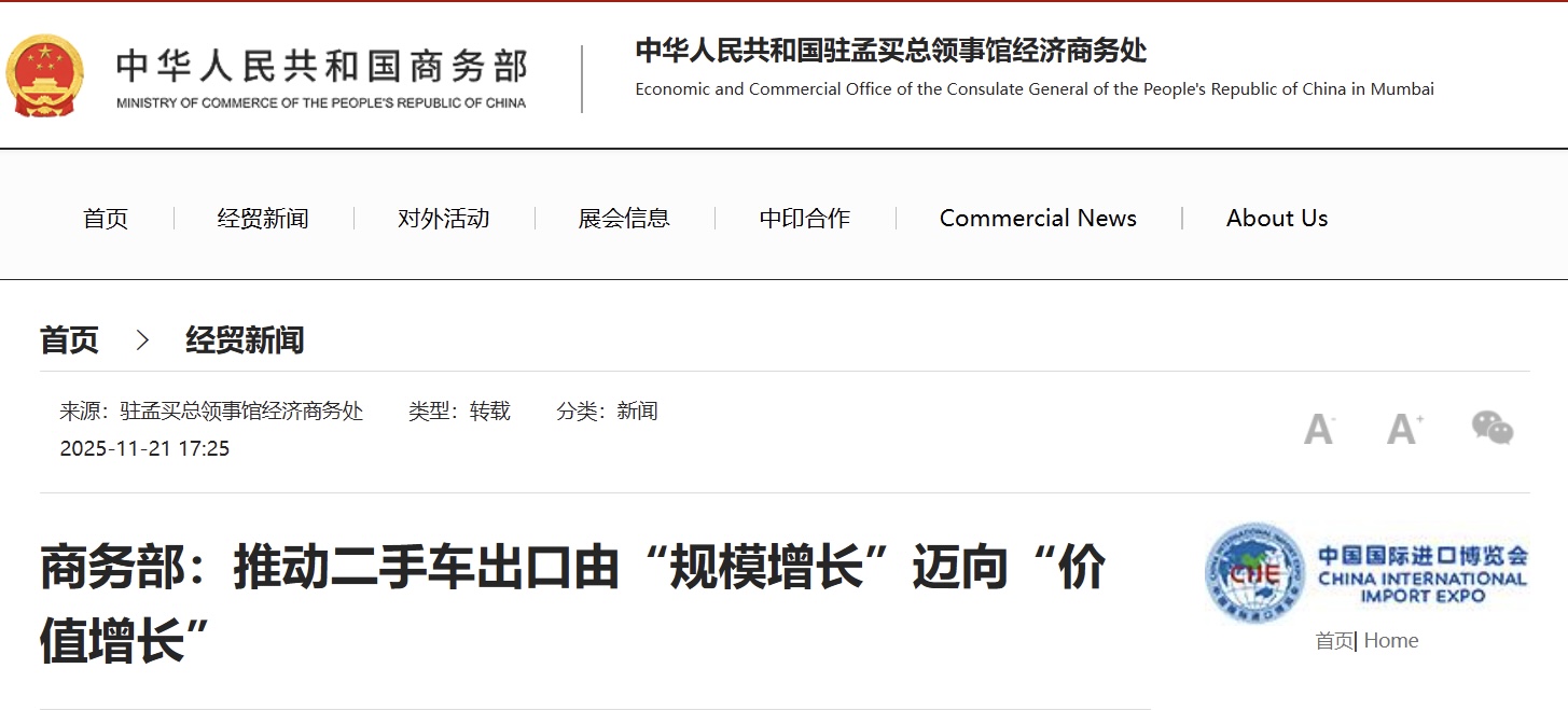 商务部新闻发言人何咏前11月20日表示,商务部将会同相关部门,指导各地抓好政策落实,推动二手车出口由“规模增长”迈向“价值增长”,为全球消费者提供更丰富多元的产品选择。
