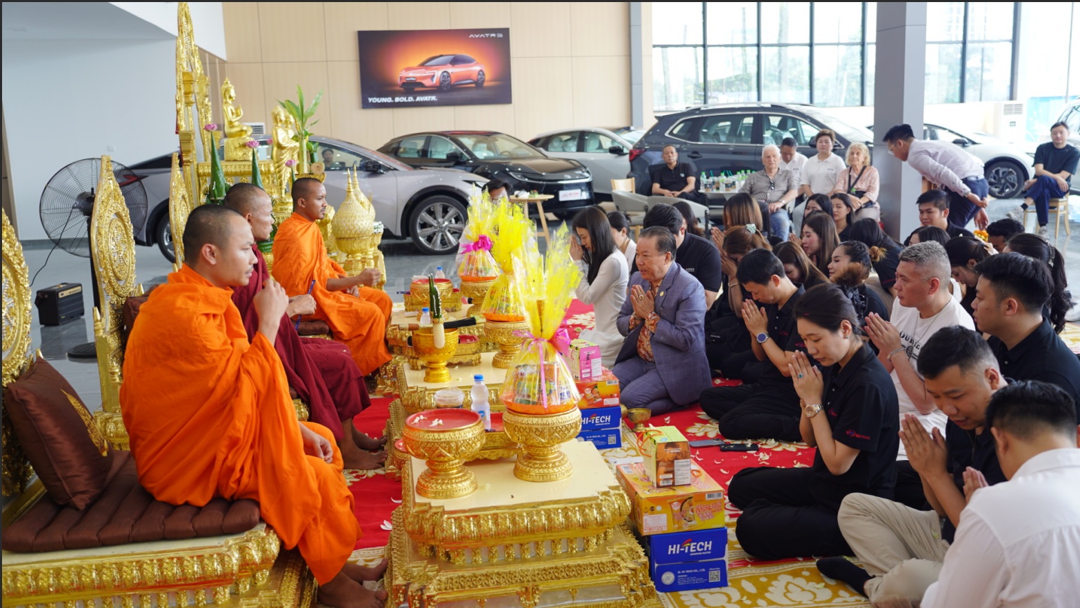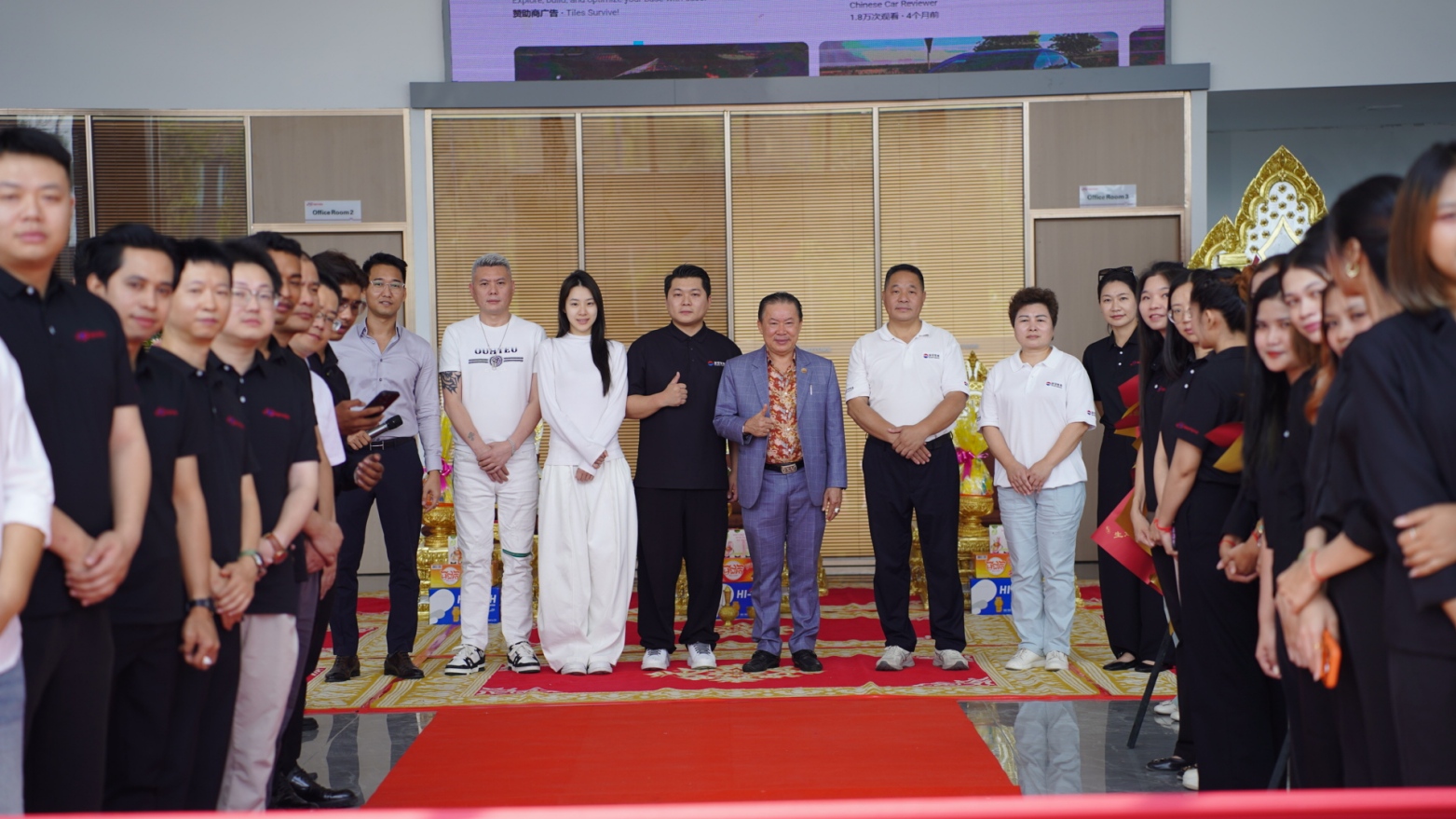 庆典现场,多款热门车型集中亮相,吸引众多客户驻足咨询。现场尊重当地传统习俗举办祈福仪式,并推出开业限时礼遇,包括购车优惠、购车有礼等活动,现场气氛热烈。多位中柬合作伙伴代表到场祝贺,共同见证这一重要时刻。