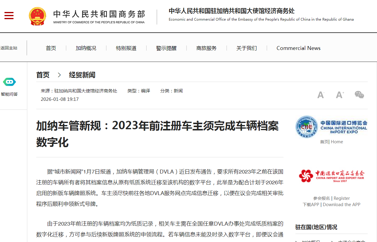据“城市新闻网”1月7日报道,加纳车辆管理局(DVLA)近日发布通告,要求所有2023年之前在该国注册的车辆所有者将其档案信息从原有纸质系统迁移至该机构的数字平台,此举是为配合计划于2026年启用的新版车辆牌照系统。车主须尽快前往各地DVLA服务网点完成信息迁移,以便在议会完成相关审批程序后顺利申领新式号牌。
